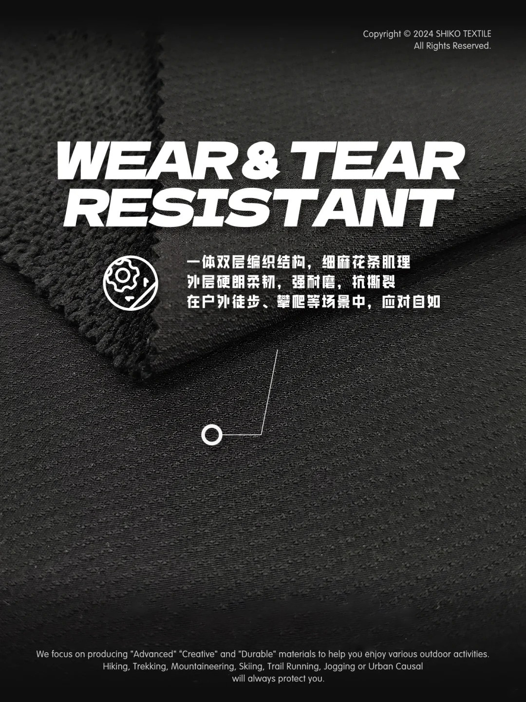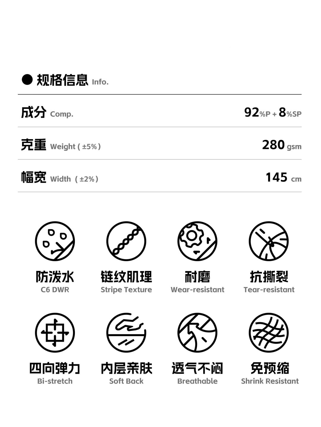 产品描述:新品秋冬麻花链条肌理弹力登山布面料,一体双层织造结构,面层紧密耐磨抗撕裂,防风,C6 DWR强防泼水,背面麻花条立体凹凸绒感底,手感柔软亲肤,同时可增加空气流通间隙,运动更透气,出汗不粘腻闷热。涤氨混纺四向弹力,为户外活动提供更高自由度。280gsm克重,具有一定厚度,适用制作秋冬徒步裤、弯刀裤、休闲长裤、软壳外套等