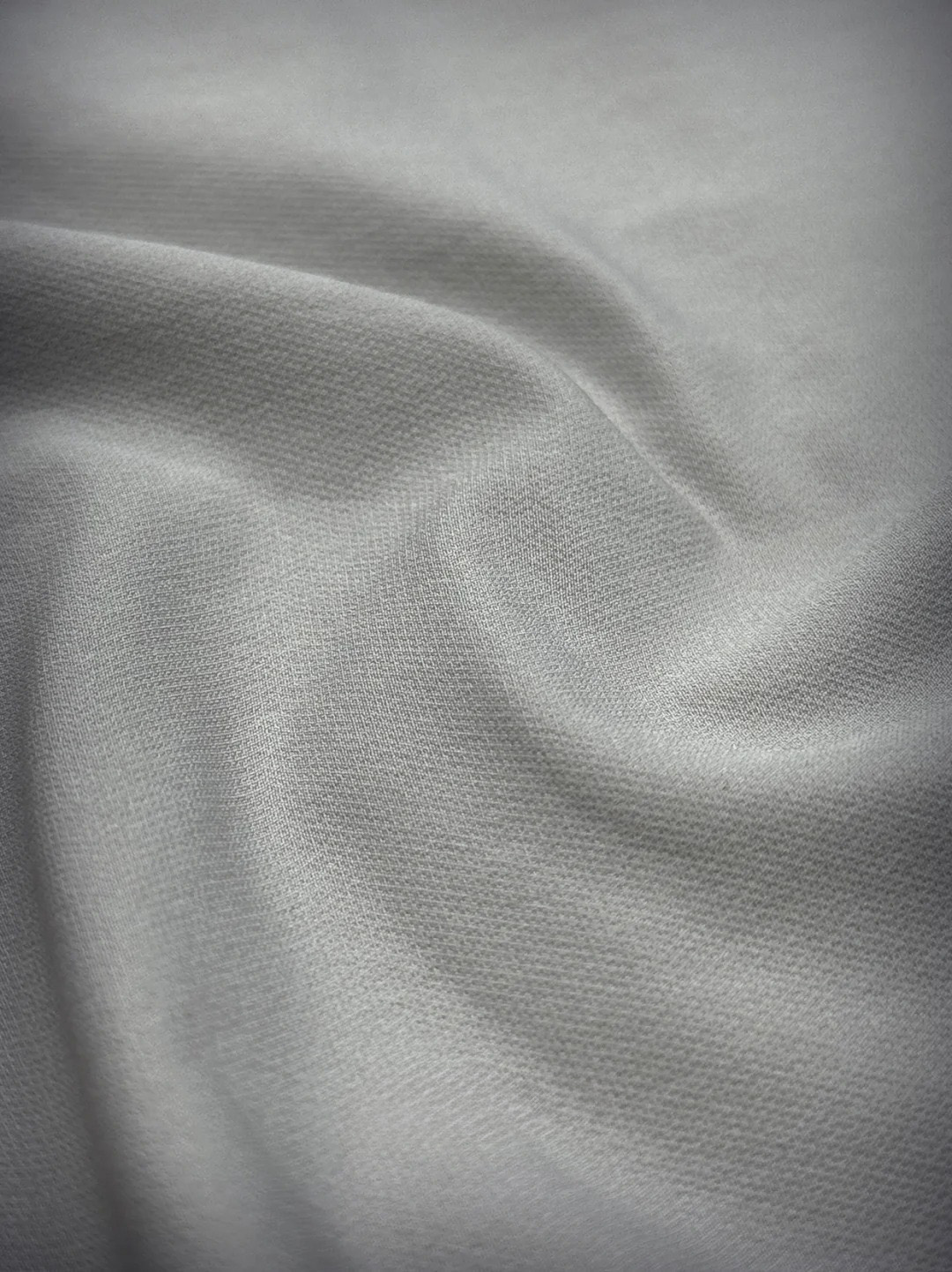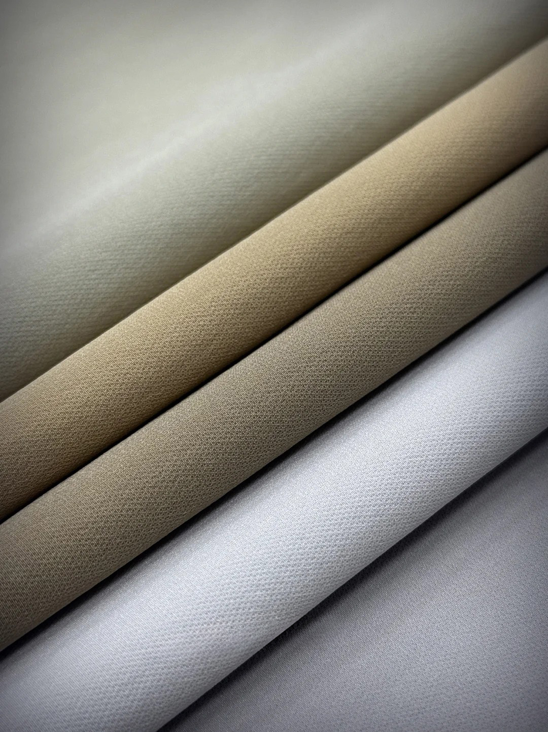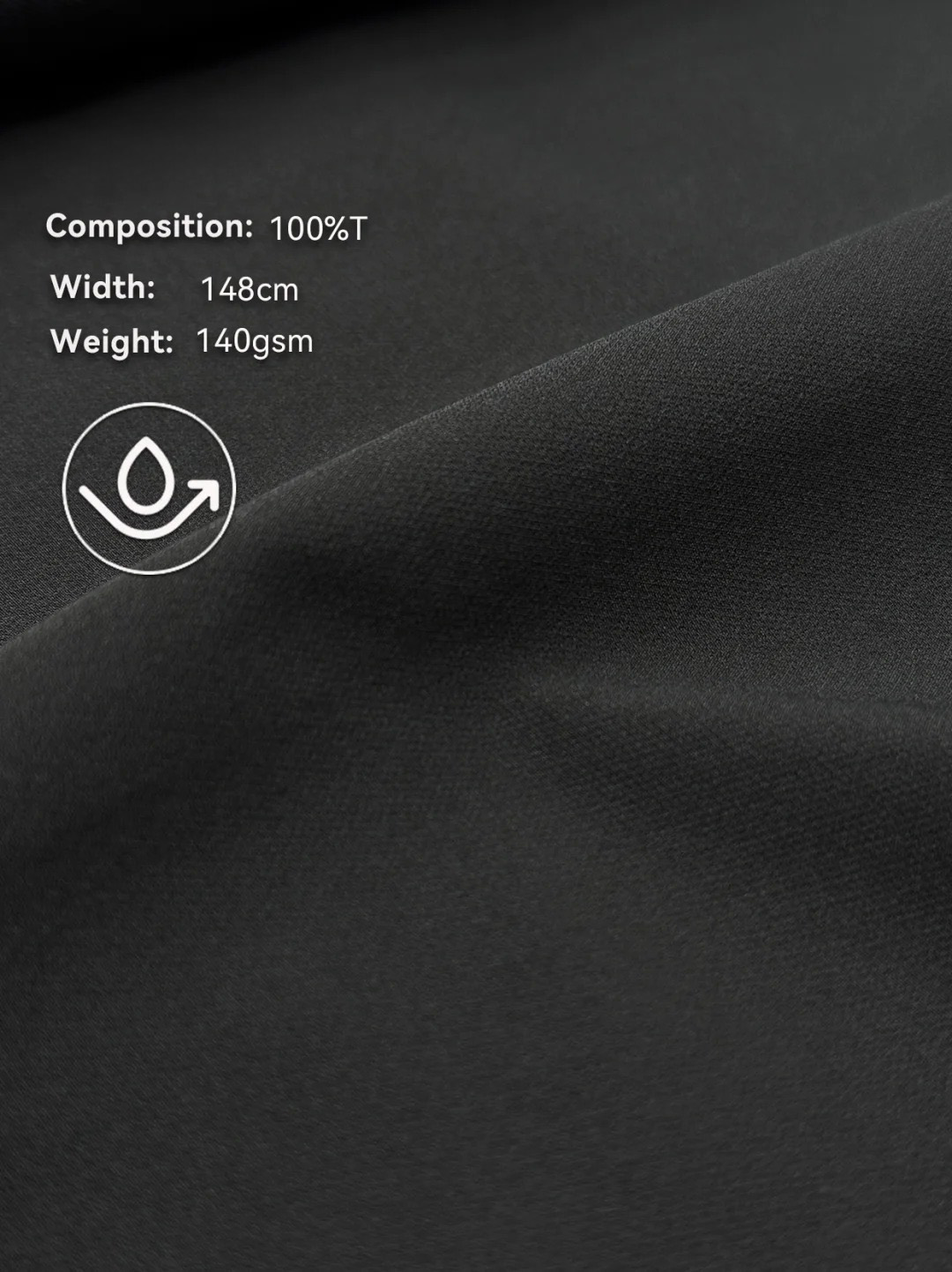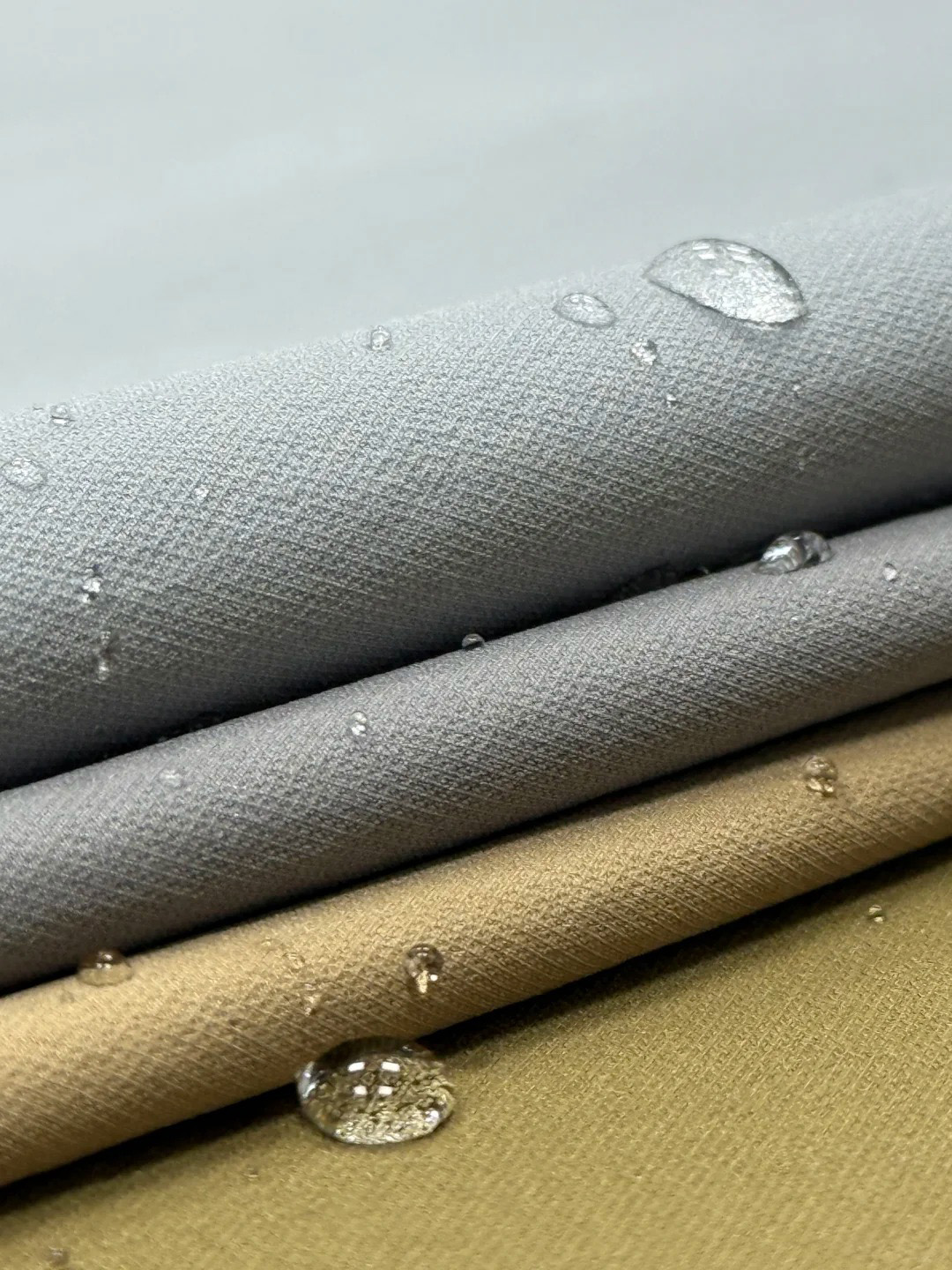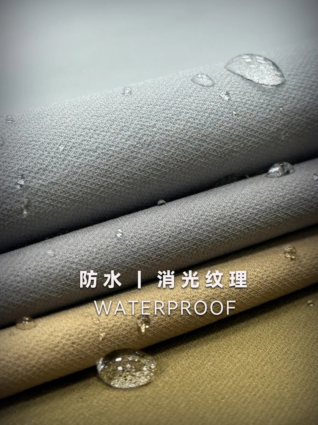 产品描述:隐形“雨衣”:防泼水功能 这可不是噱头!实测有效防泼水 ,小雨滴、意外溅水轻松滑落。户外通勤、日常穿着多一层安心,提升单品实用性和功能性,绝对加分项! 颜值担当:双面高质感纹理 正面:微微立体蜂巢格 - 远看低调,近看充满细节肌理感,比普通平纹更有层次和设计感。 反面:精致珍珠点纹理 - 独特细腻的凸点效果,触感舒适,提供另一种风格可能(内里设计小心机?)。 加分项:微微弹力! 穿着活动更舒适自如,不束缚,同时不影响面料本身的挺括骨架感。