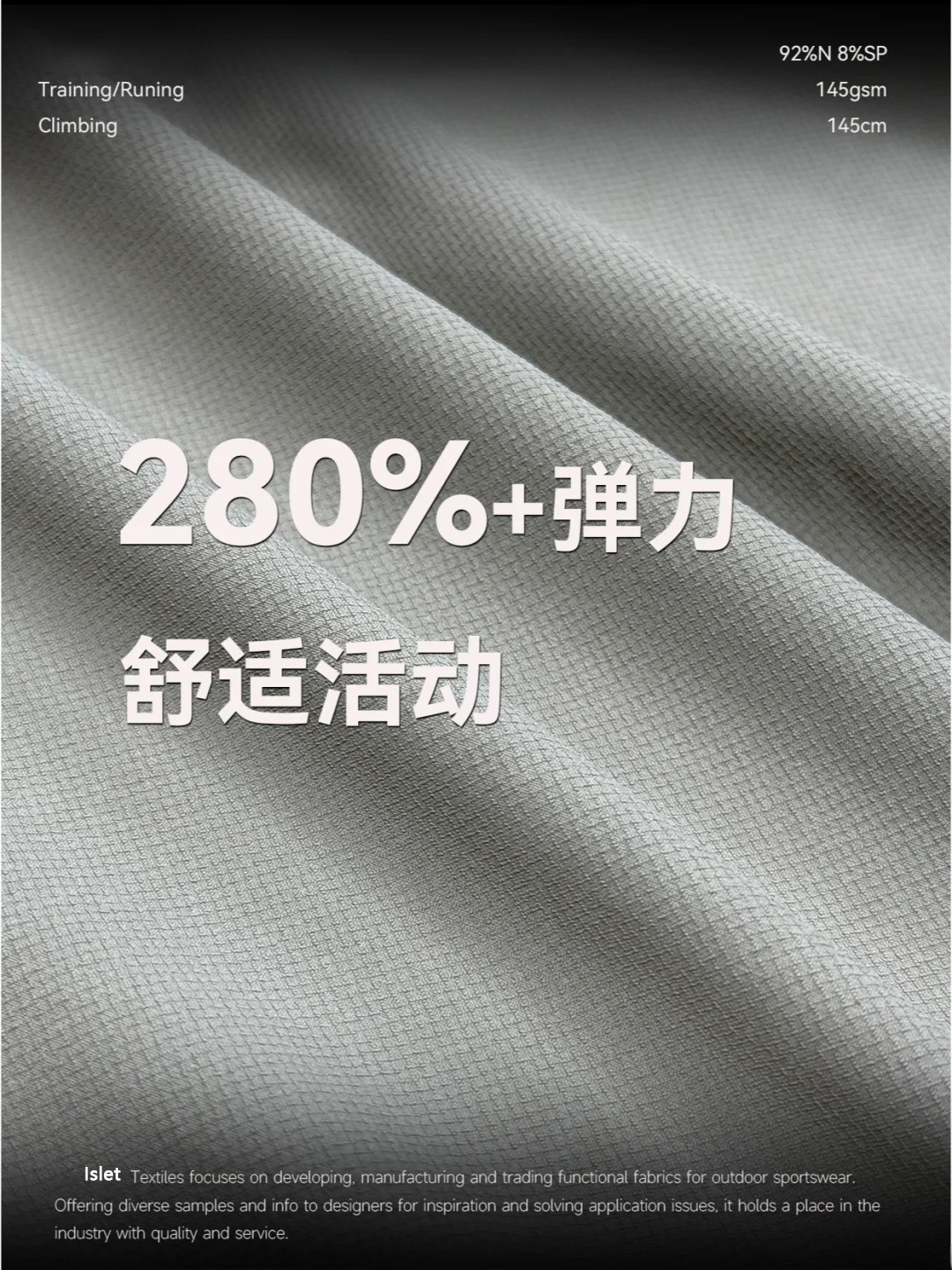 产品描述:暴力回弹: 「8%氨纶嵌入式织法」→ 实测纵向拉伸280%无变形 防粘天花板: 「军用级菱形格凸纹」→ 布面与皮肤接触面积减少61% 防水黑匣子: 「纳米盾构技术」→ 防水 耐磨小能手: 尼龙66编织,更加耐磨