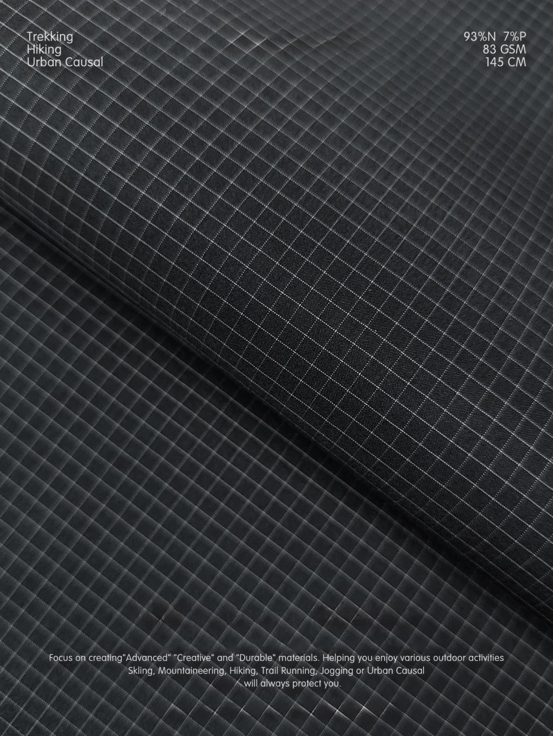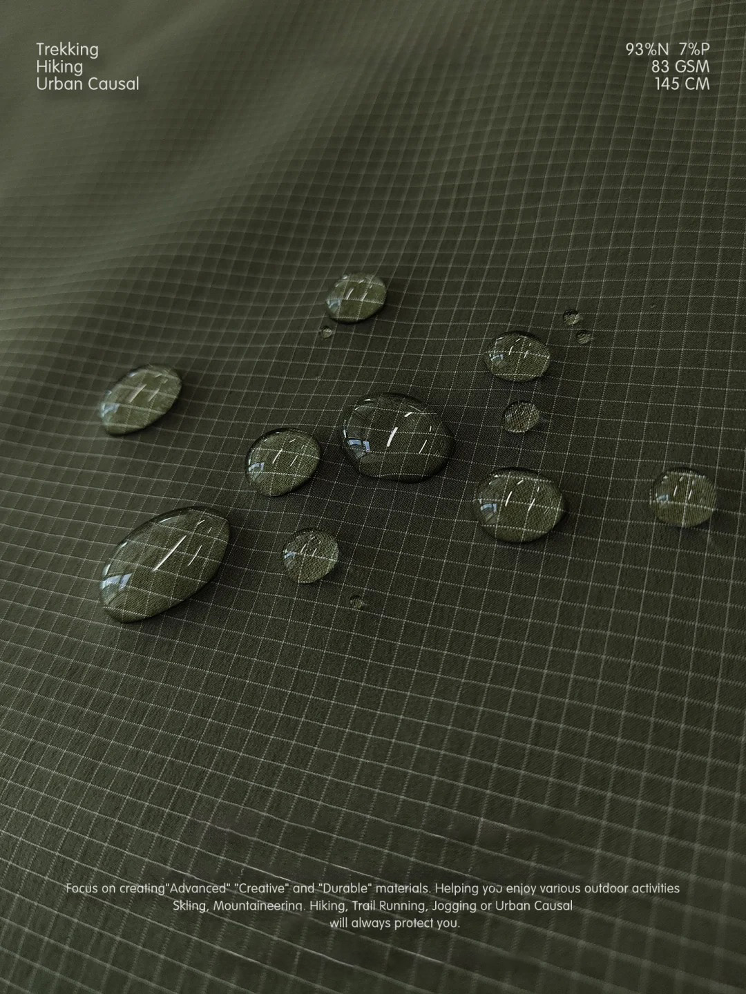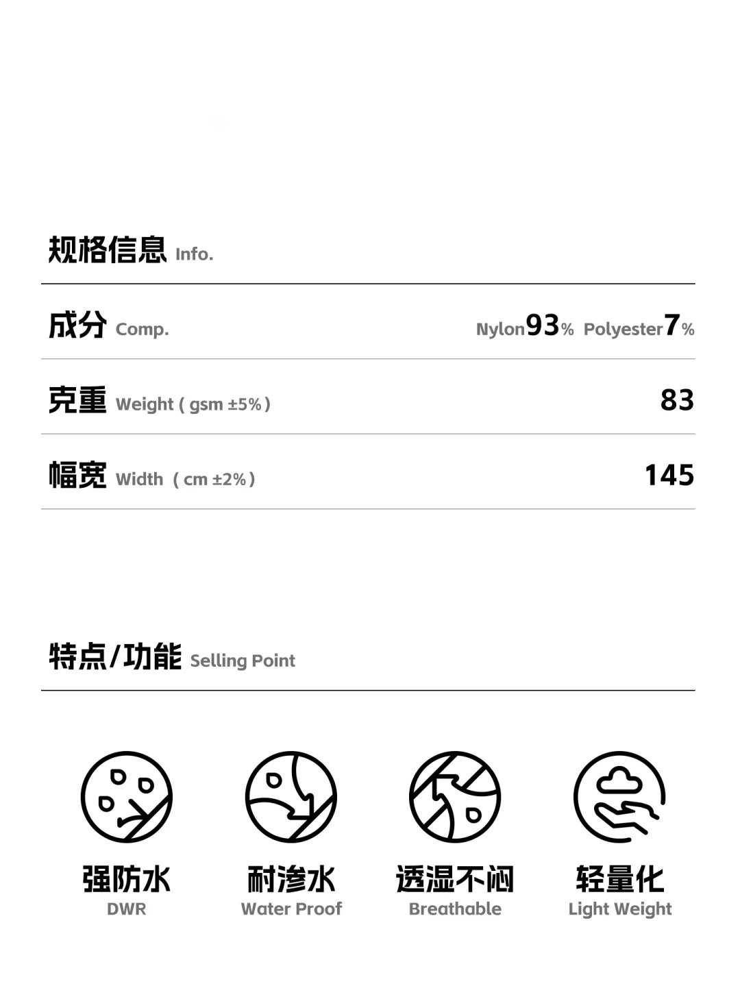 产品描述:新品锦涤格子3L功能性面料,独特白色单线格纹,DWR强防水4级,防风,轻量化(平方米克重83gsm),3L复合结构,耐静水压国标8000+,可防暴雨,透湿性10000+,出汗不闷,多色可选,适用制作户外冲锋衣硬壳、冲锋裤、功能性夹克、秋冬功能性羽绒棉服等。
