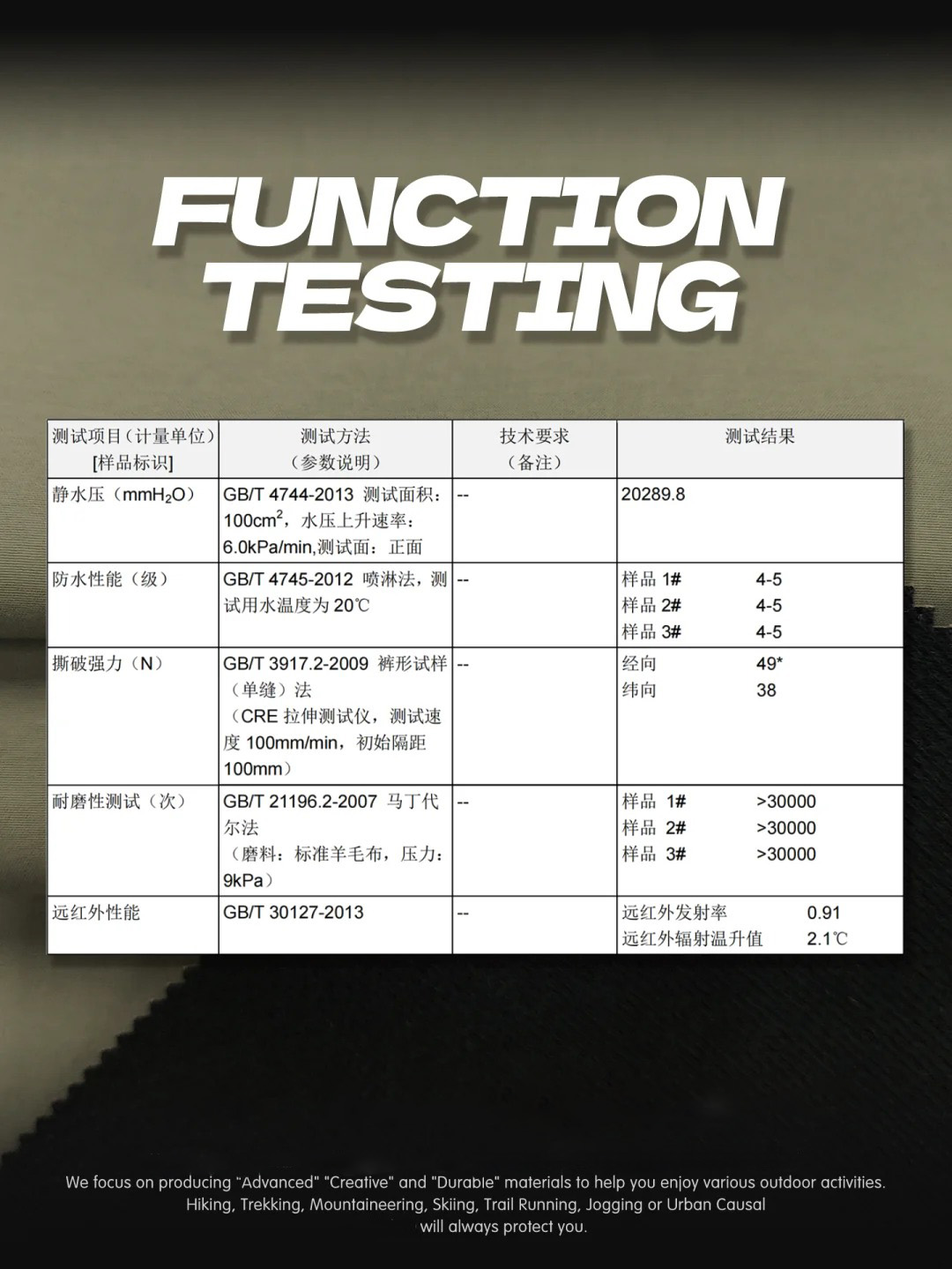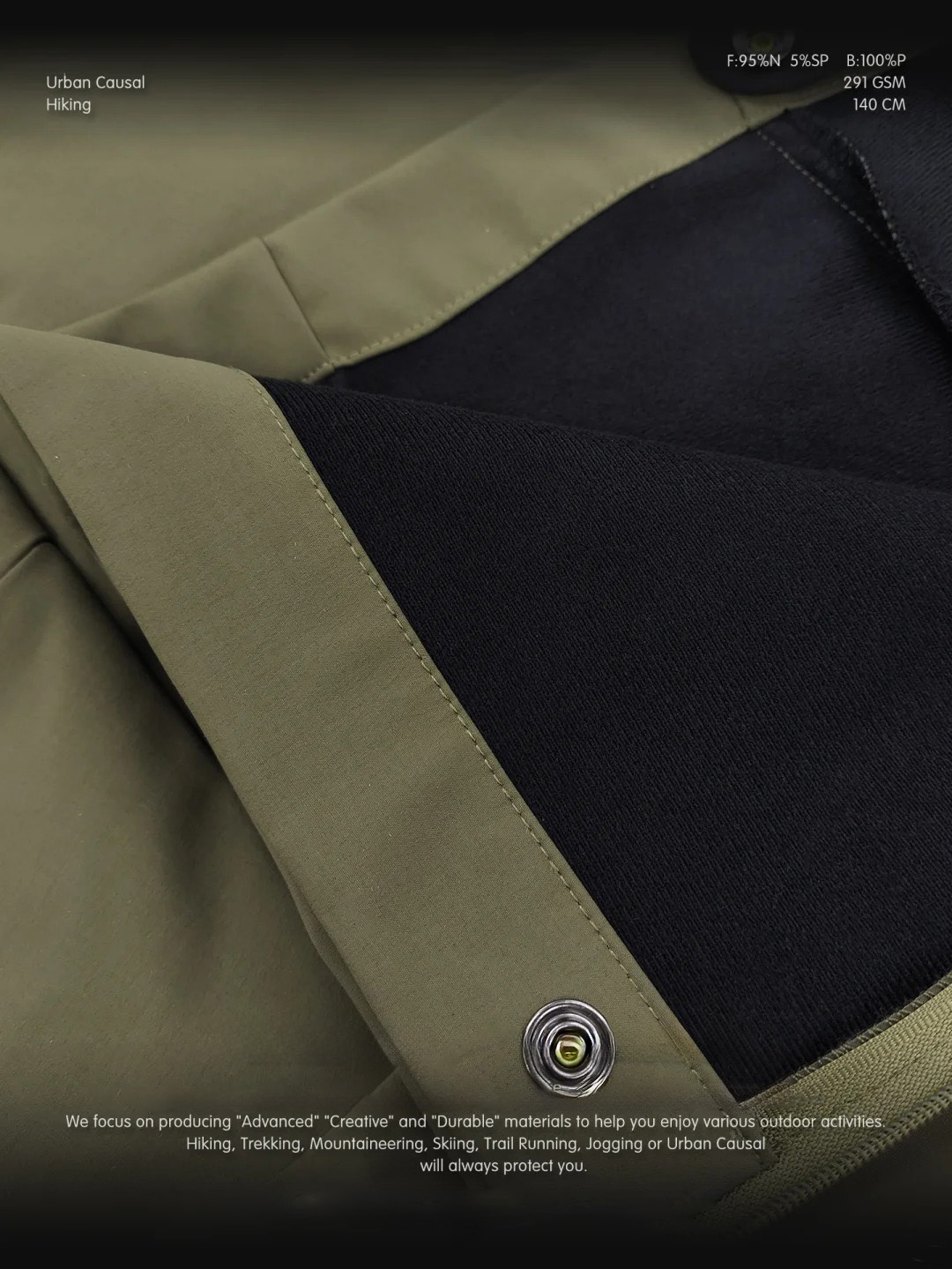 产品描述:新品秋冬尼龙3L复合绒底硬壳功能面料,表布纬向微弹,经DWR强防水处理,贴合TPU高透白膜,防风,国标耐水压20000+mmH2O,轻松应对秋冬雪水及日常液态泼溅,底面复合独特磨毛针织布,柔软亲肤,兼具远红外功能,吸收阳光远红外转换为热能,显著升温2℃+,持久蓄热保暖,维持体温。复合成品耐磨30000+,优秀抗撕裂性,挺阔厚实,适用制作各类专业户外硬壳冲锋衣裤、滑雪服衣裤、防水夹克外套、风衣等。 ·